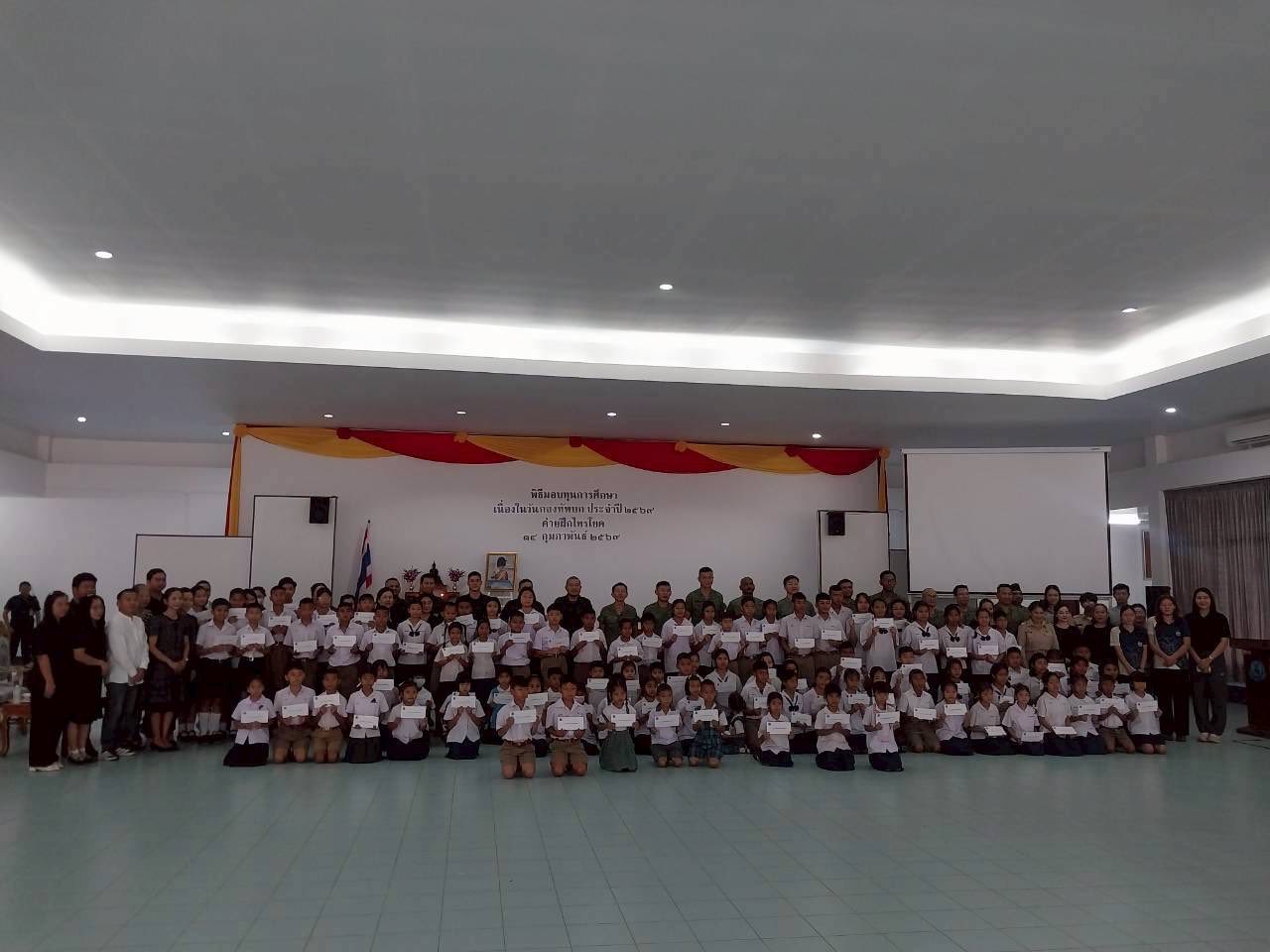วันเสาร์ ที่ 14 กุมภาพันธ์ พ.ศ.2569 นางทิพวรรณ ศรท้วมตำแหน่งผู้อำนวยการโรงเรียน มอบหมายคุณครูณัฐธมนพัณณ์ ไชยปรุง พานักเรียนเข้าร่วมพิธีมอบทุนการศึกษา เนื่องในวันกองทัพบก ประจำปี 2569 ณ ค่ายฝึกไทรโยค จังหวัดกาญจนบุรี